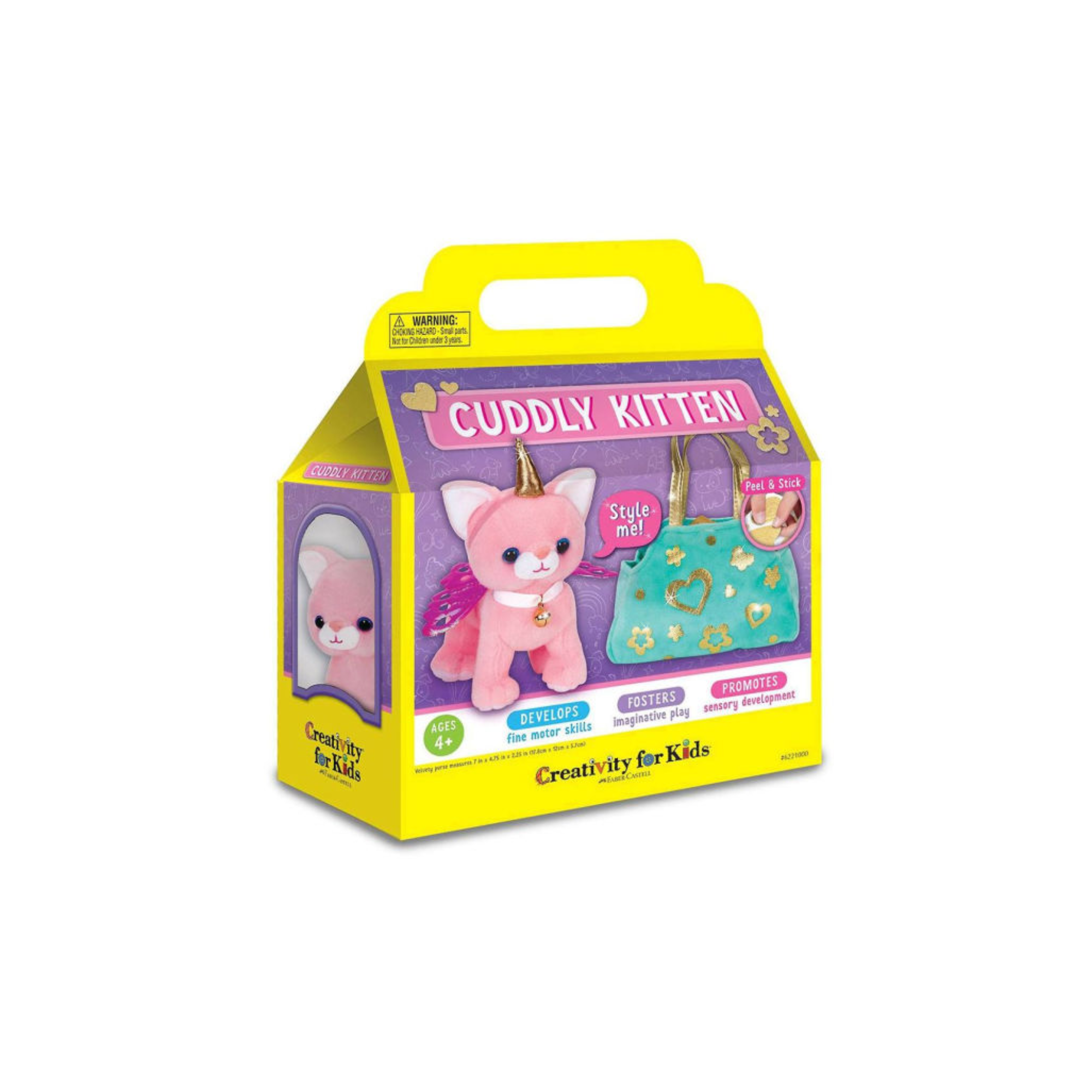 This cuddly kitten will be your purr-fect crafting companion. Decorate this plush kitten and velvety pet carrier with an array of adorable accessories including: ribbon and bell collar, metallic gold stickers, unicorn horn and shiny butterfly wings. No glue, no mess! Develops fine motor skills, fosters imaginative play and promotes sensory development. Designed to comfort and cuddle, your completed carrier measures 7” w x 4 ¾” h x 2 ¼” d and the kitten measures 6 ½” w x 6” h.