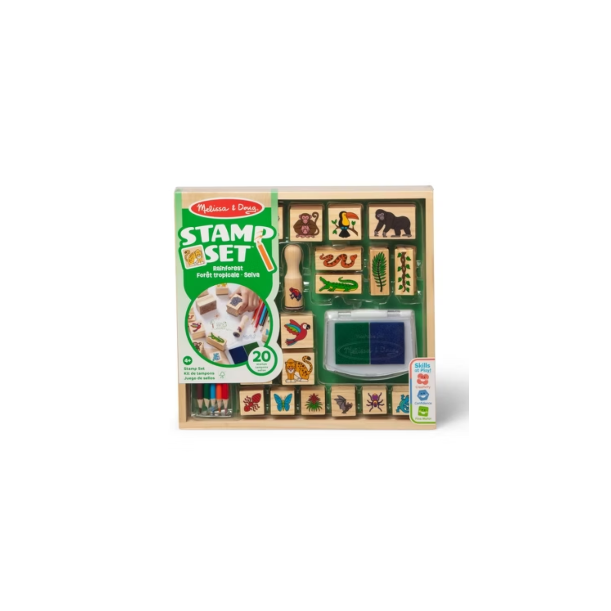 - Includes 20 stamps, 5 colored pencils, durable 2-color stamp pad and wooden storage tray.